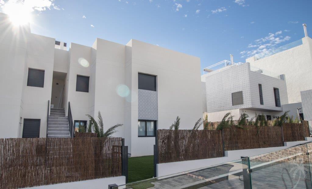 This beautiful newbuild project in Orihuela Costa comes with properties in different types with different numbers of bedrooms. Each model has its own layout with alternating 2 or 3 bedrooms on the ground floor or the first floor. When purchasing, you choose between an apartment with a garden or a penthouse with a roof terrace. This page is about the 3 bedroom penthouse. The master bedroom has an en-suite bathroom and fitted wardrobes. The bathrooms are tiled and the kitchen comes with the extractor. Pre-installed air-conditioning pipes have also been installed in the living room and bedrooms. The two blocks are near a communal swimming pool where you can enjoy the Spanish sun. Completion takes place in May and June 2020! Schedule a viewing? Contact us by mail or call us directly.