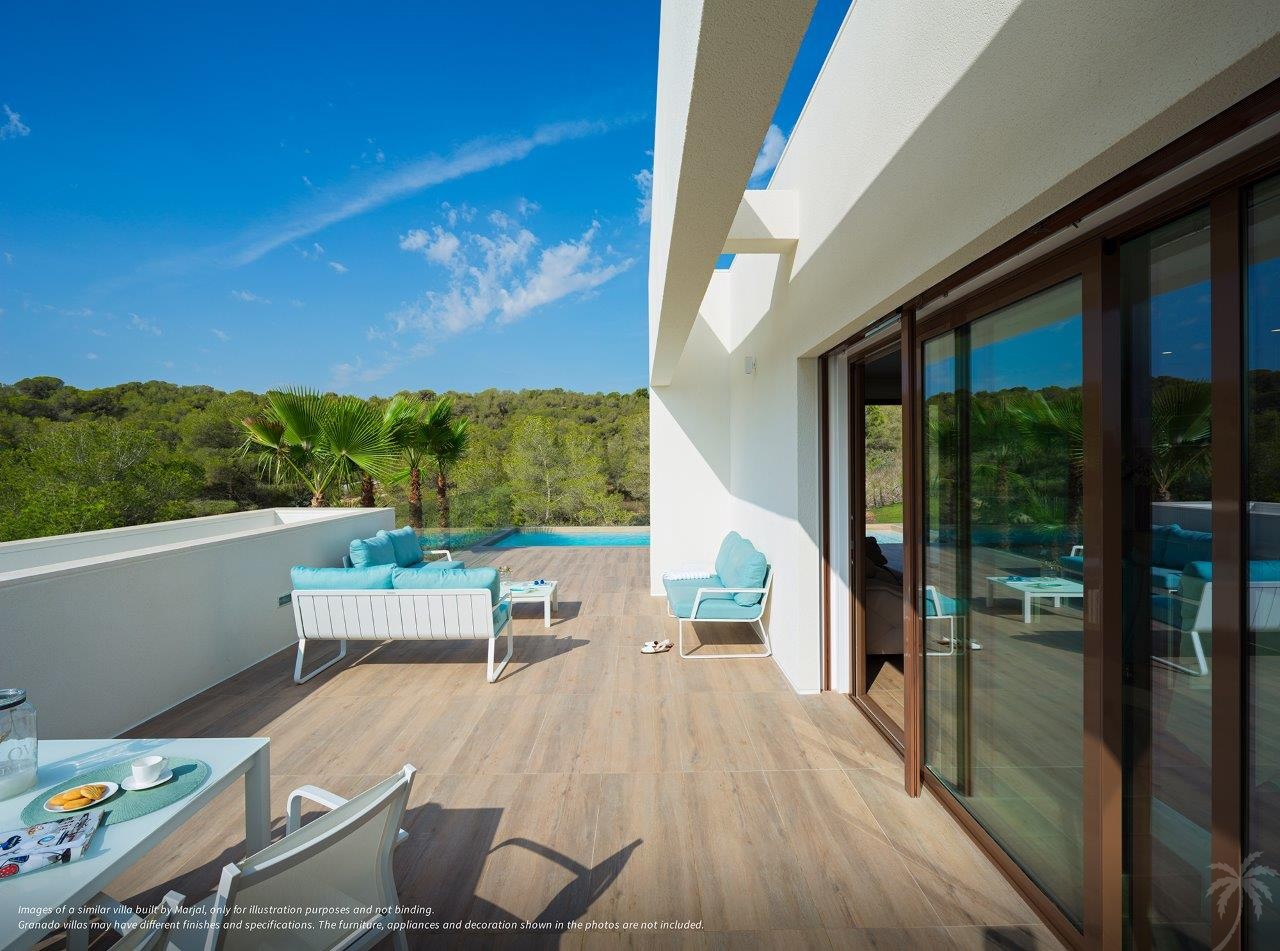Beautiful villas on the Las Colinas golf resort. This beautiful new construction project consists of different models of houses. This model has 150 m2 of living space which is spread over two floors, the ground floor is the living floor, with a modern kitchen and bright living / dining room and the master bedroom with ensuite bathroom. On that floor below are 3 bedrooms, a bathroom and a storage room. All properties in this project also have a private swimming pool and a roof terrace. The beautiful architecture and location make this a unique project! Contact us for more information.