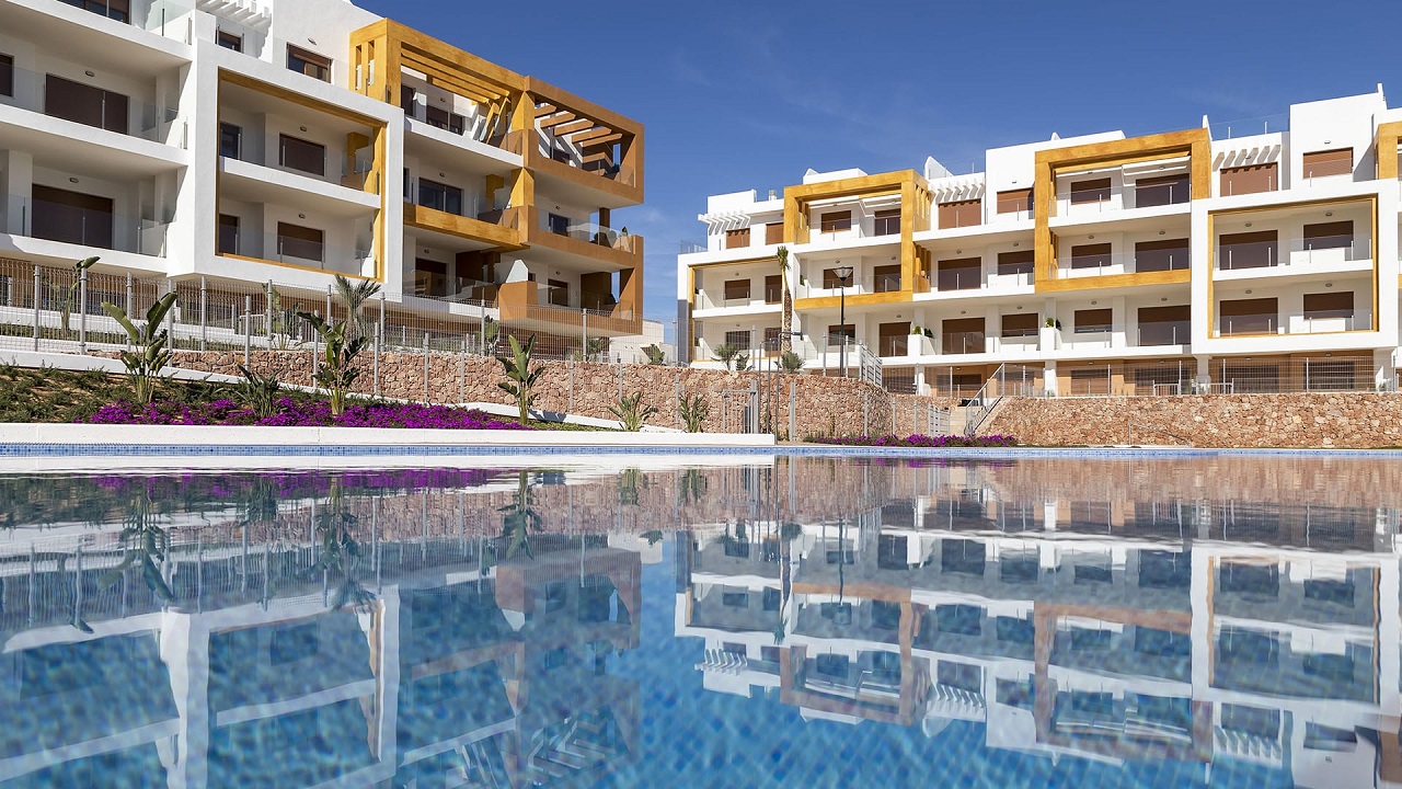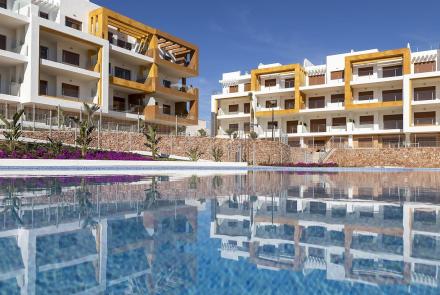 This beautiful apartment complex is being built in the popular Orihuela Costa. Houses come in different models in the complex. This model starts with a living space of 69 m2 and has 2 bedrooms, 2 bathrooms, a storage room, a modern kitchen and a living / dining room. These houses have a spacious terrace of 20 m2. This model is also available as a ground floor apartment with garden, or as a penthouse with roof terrace. The indicated price is a starting price. The complex contains various green areas and a beautiful communal swimming pool. The houses will be delivered in December 2019 and can be delivered furnished (incl. White goods) against payment. Contact us for more information!