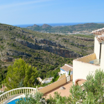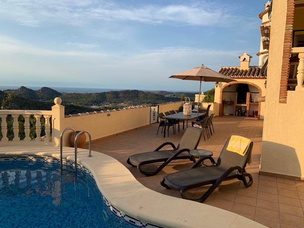 Beautifully situated villa with private pool and panoramic views over the green mountains and valley towards the coastline of Denia. This house was built in 2004 in a quiet cul de sac in a modern residential area of Pedreguer and is fully equipped. On the main level is the living area with a nice terrace and the kitchen and one floor below are the bedrooms and a nice covered terrace. At the pool is a spacious terrace and outdoor kitchen, ideal for the long summer evenings.