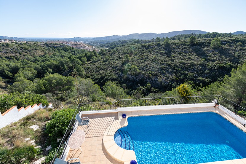 A spacious 3 bedroom, 1 bathroom, Detached Villa located in a quiet cul de sac with fantastic views to the sea and close to the village of Pedreguer. The property has a gate leading to steps down to the main entrance and the accommodation all on one level comprising a spacious lounge/dining room with enclosed naya and great views, fitted kitchen, and an inner hallway leading to three bedrooms and a bathroom. Stairs lead outside to a large under build which could be converted to further accommodation subject to licenses. The villa benefits from a large swimming pool and terrace and the property adjoins open countryside. There are mature garden areas and seating areas.
