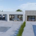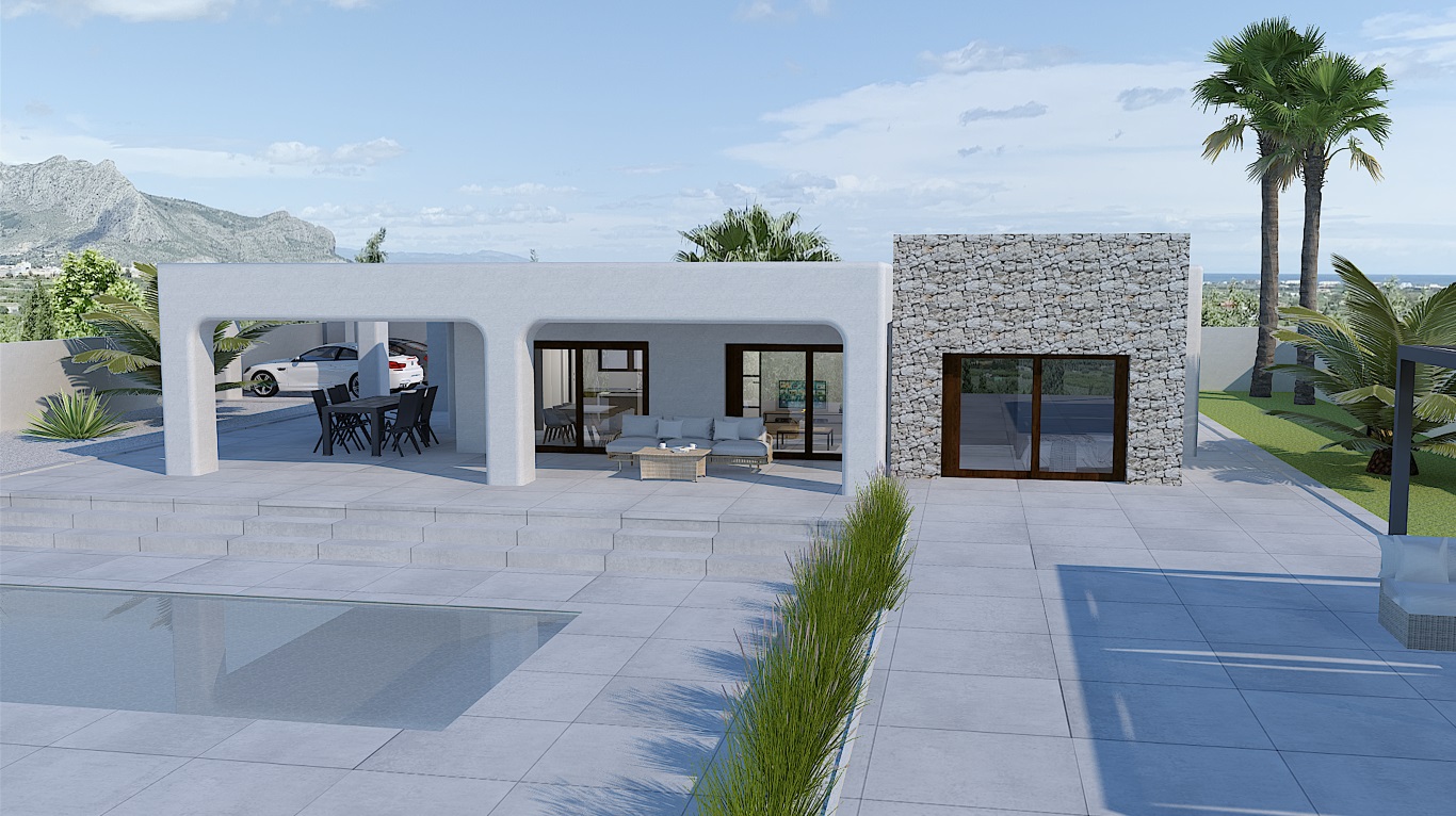 This beautiful single storey new country home in Ibiza style is under construction and ilocated in a quiet and green area near Pedreguer. The property benefits from beautiful views of the Montgo nature reserve and the sea, you can walk from your backyard into the protected nature reserve. This Ibiza style home is completely on one level and consists of a spacious living & dining room, built-in fireplace, open plan kitchen with utility room, for washing machine, dryer and heat pump. The living room, kitchen, and bedroom have aluminum sliding doors that provide access to the terrace.