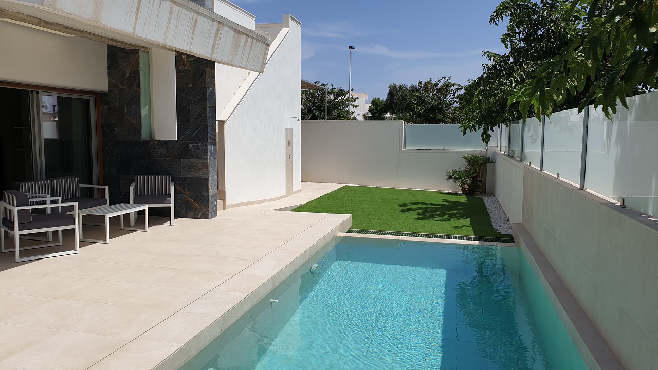 Modern new built project consist of 6 linked houses and is situated within walking distance from the center of San Pedro del Pinatar. The properties consist of 3 bedrooms, 2 bathrooms, cosy living room and kitchen. Each property is equipped with led illuminating, aircon and whitegoods. You can enjoy the lovely Spanish climate in the nice garden with private swimming pool or at the solarium. Many amenities like shops, restaurants, beach, etc. are situated within just a few kilometres. Are you interested in this project and do you want more information, please do not hesitate in contacting us.