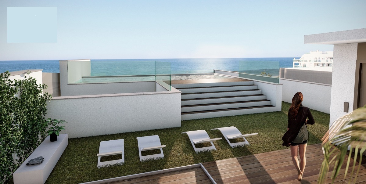 Modern new construction project right next to the beach in Torrox. The luxuriously designed complex consists of 12 apartments of 2, 3 or 4 bedrooms. This unique penthouse consists of 3 stories in total: lowest floor with 4 bedrooms, middle floor with living room and kitchen, on the top floor you have a spacious roof terrace with private swimming pool. If that's not enough, the beach is just 280m away. Would you like to receive more information about this project? Please feel free to contact us.