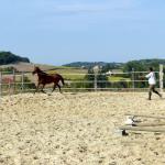 Een paardenbak van 40 bij 20 m met Fontainebleau-zand die van het domein gescheiden wordt door een rustig landweggetje.