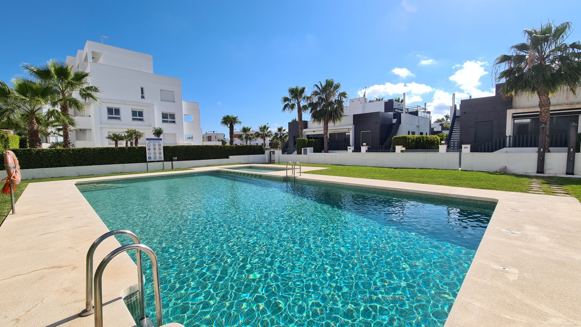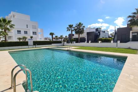 Close to the popular shopping center La Fuente and within a few kilometers of the sandy beaches of the Orihuela Costa, we find this beautiful, modern, semi-detached house. The house is located within a secured domain where parking spaces are also available. The furniture you see in the pictures is included in the sales price. The terrace at the front is orientated to the South-East, but there is a spacious roof terrace for the afternoon sun. Are you interested in this property and would you like more information? Do not hesitate to contact us.